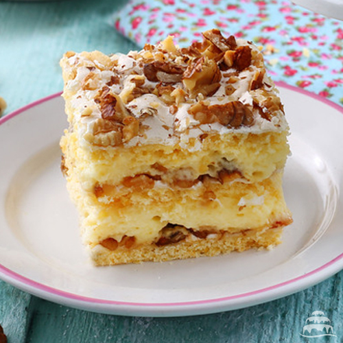 Igazi diós költemény, tojáshabos, diós lapok közt vaniliakrémmel. Legalább 25*25cm-es lapokból készül, szeletelés nélkül.Szeletelés +300 Ft