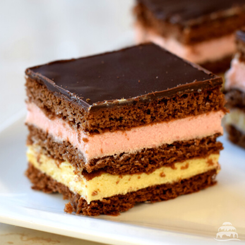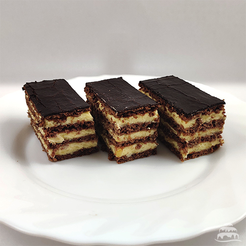 Kakaós lapok között mennyei vaniliakrém, csokival a tetején. Legalább 25*25cm-es lapokból készül, szeletelés nélkül.Szeletelés +300 Ft